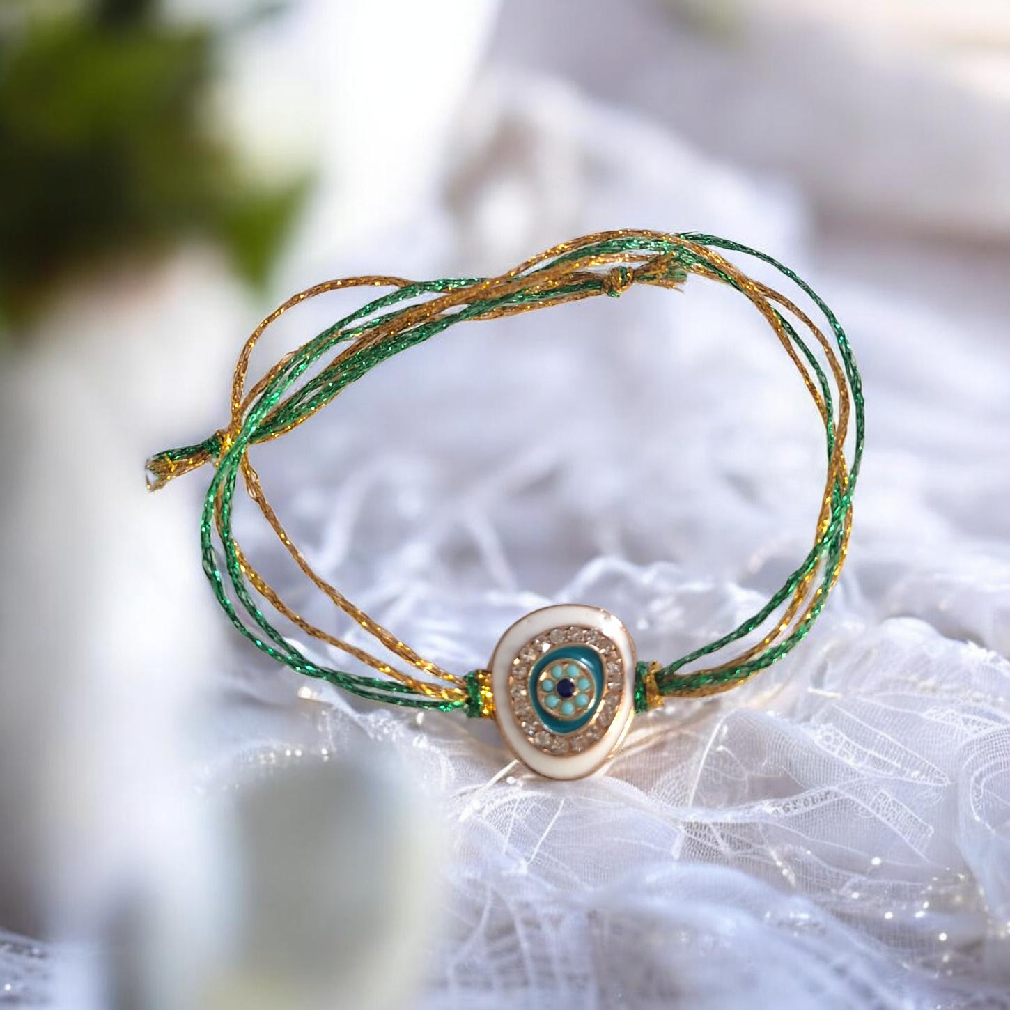 Το βραχιόλι ματάκι λευκό με κορδόνι χρυσό και πράσινο συνδυάζει την αισθητική και την προστασία σε ένα μοναδικό αξεσουάρ. Ιδανικό για καθημερινή χρήση ή για ξεχωριστές εμφανίσεις, προσφέρει έντονη παρουσία με διακριτική κομψότητα.