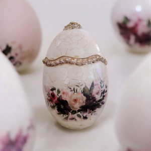 Το συνδυασμένο ντεκουπάζ και κρακελέ τεχνική προσδίδει σε αυτό το αντικείμενο μια μοναδική υφή και αισθητική. Κάθε αυγό είναι φτιαγμένο με αγάπη και καλλιτεχνία, δημιουργώντας ένα αρμονικό αποτέλεσμα που εντυπωσιάζει κάθε επισκέπτη. Η τεχνοτροπία κρακελέ, με τη χαρακτηριστική σχισμένη εμφάνιση, προσθέτει μια vintage και σοφιστικέ αίσθηση.