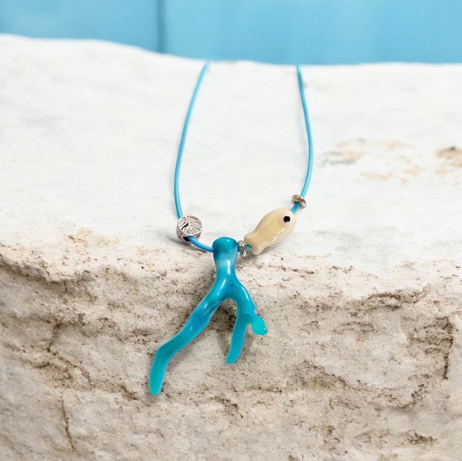 Ανακαλύψτε τη διαχρονική ομορφιά του καλοκαιρινού κολιέ με γαλάζιο κοράλλι και διακριτικό λευκό ψαράκι, που φέρνει την αύρα του καλοκαιριού στις εμφανίσεις σας.