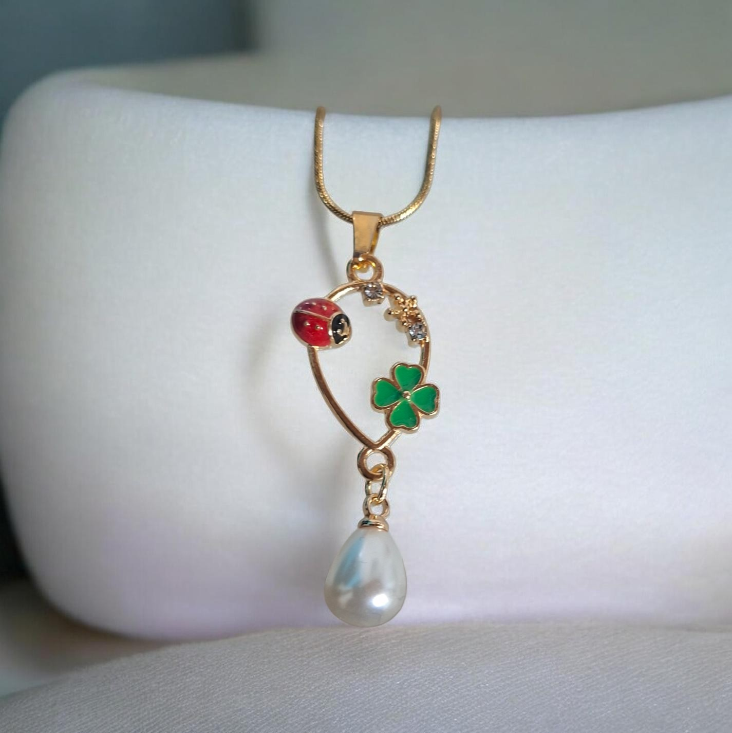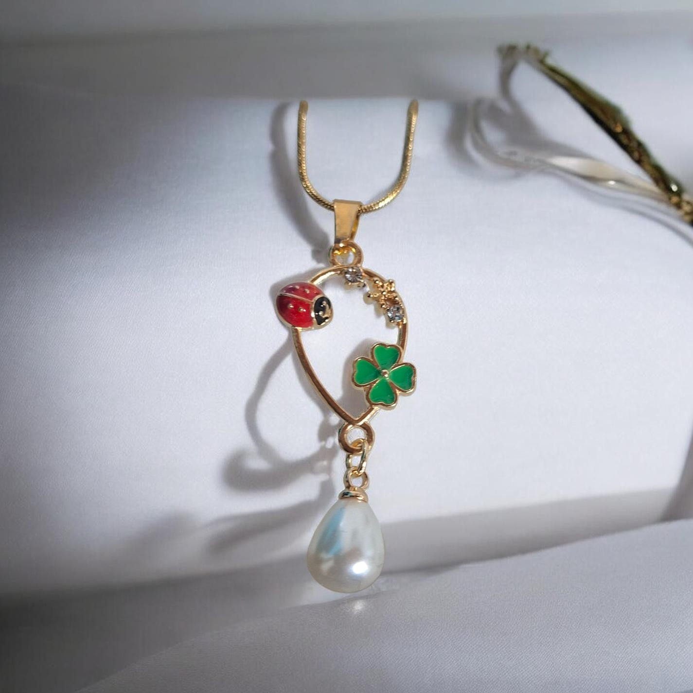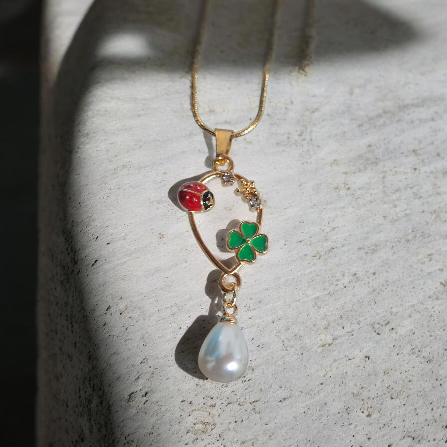 Το πράσινο τριφύλλι, σύμβολο τύχης, και η πασχαλίτσα, σύμβολο ευημερίας, δίνουν στο κολιέ ιδιαίτερη σημασία πέρα από την αισθητική του. Ιδανικό για προσωπική χρήση ή σαν ένα προσεγμένο δώρο για αγαπημένα πρόσωπα.