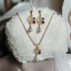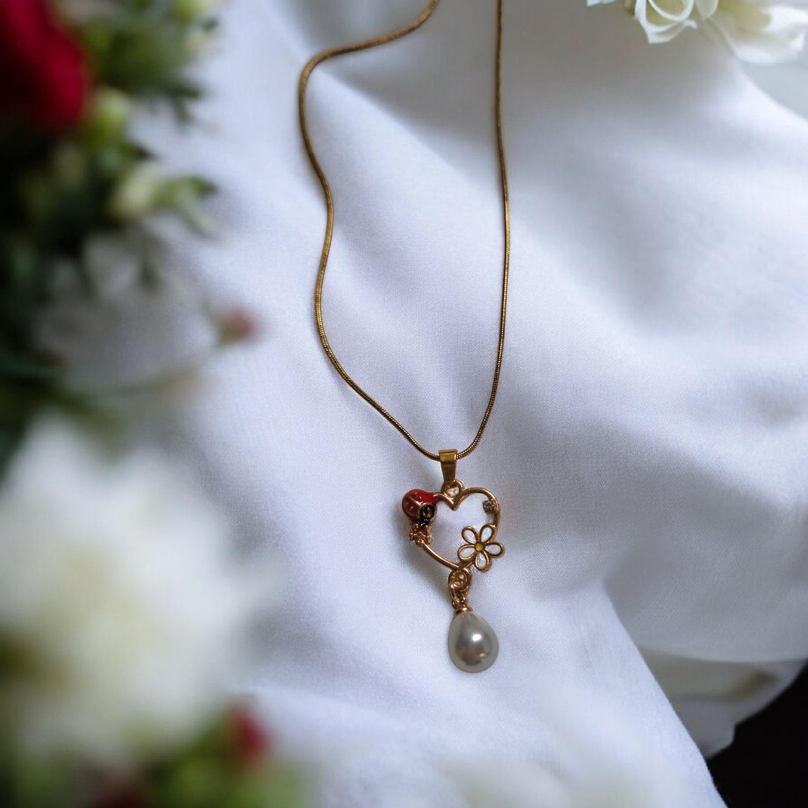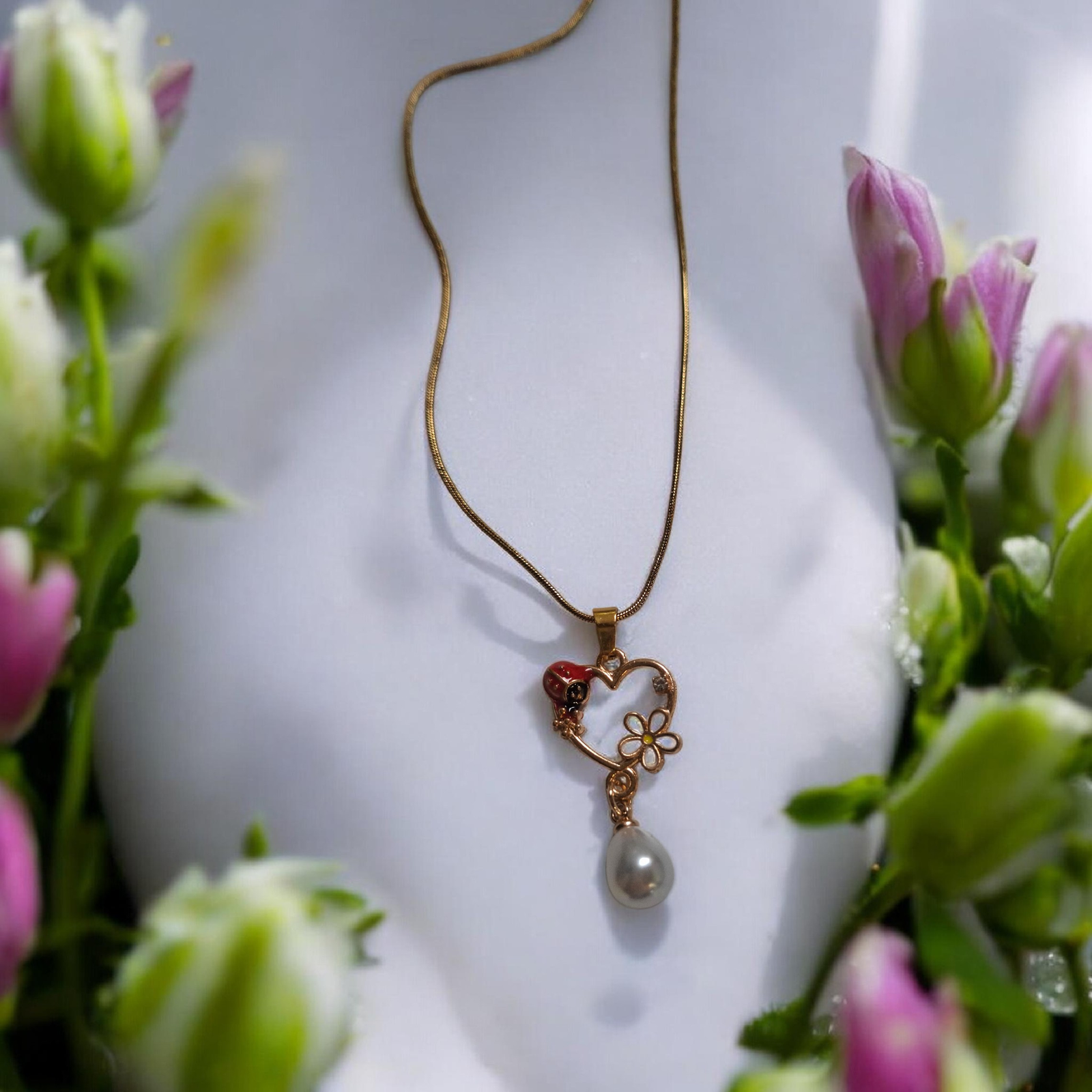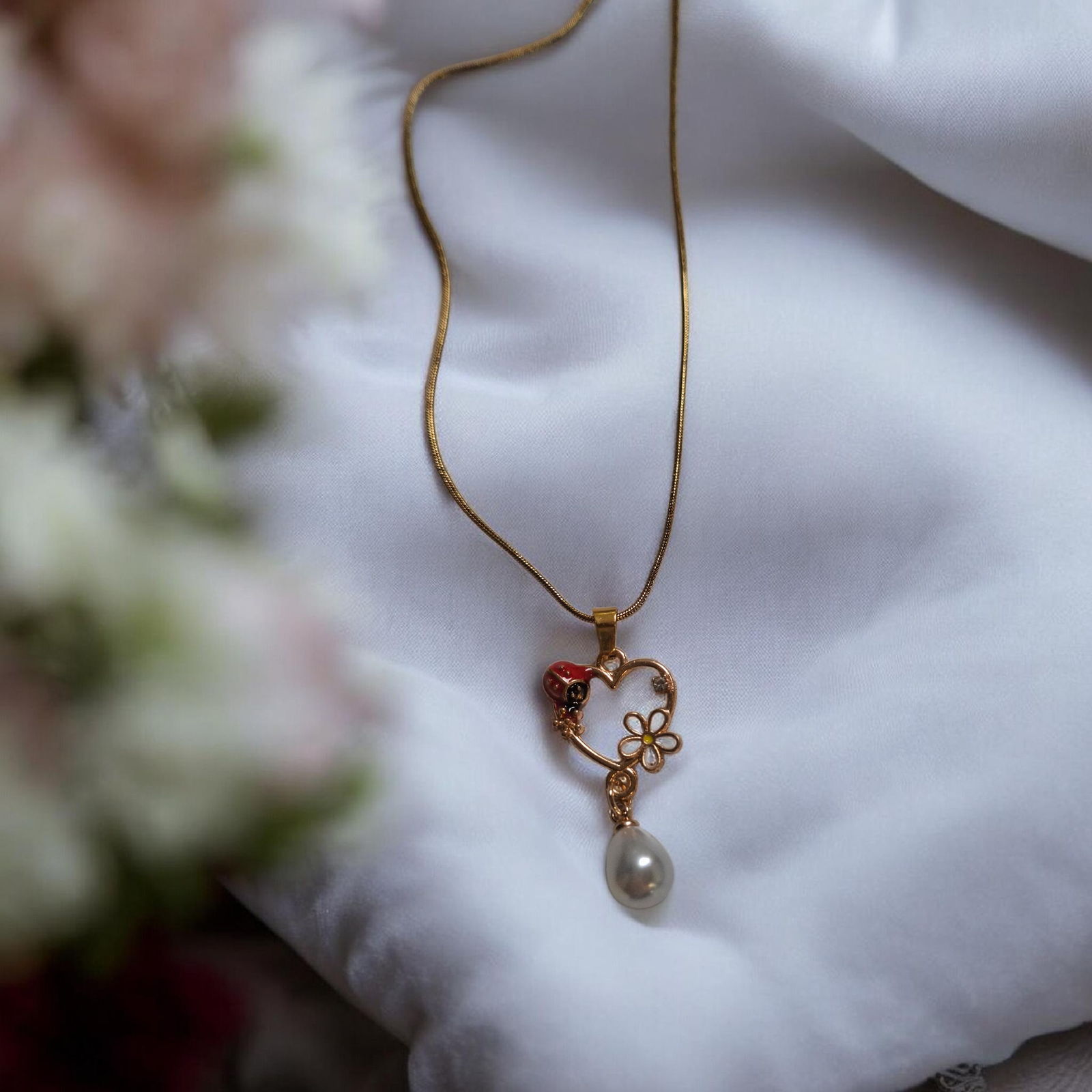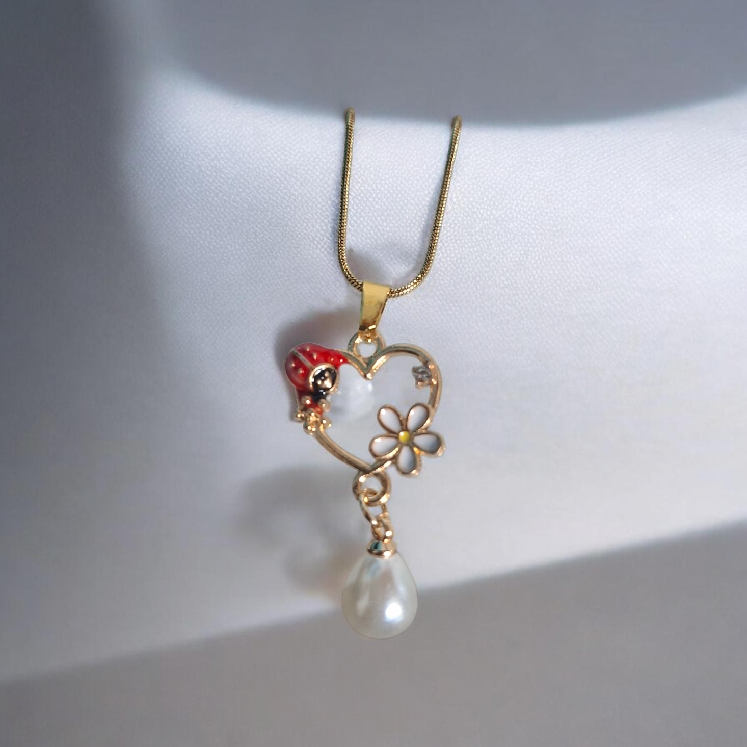Κολιέ με μεταλλική καρδιά με πασχαλίτσα μαργαρίτα και λευκή πέρλα