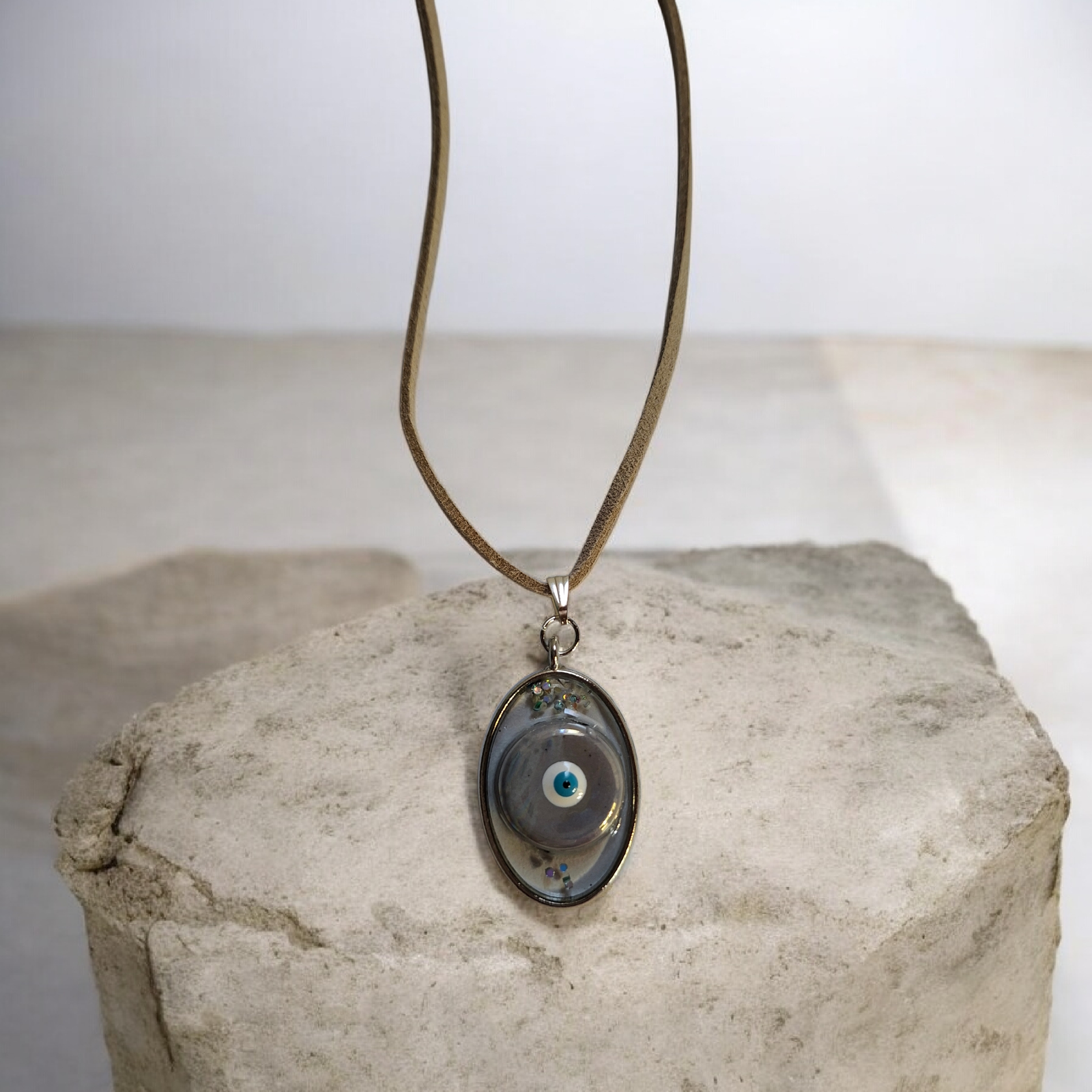 Το κολιέ είναι φτιαγμένο από υγρό γυαλί υψηλής ποιότητας, το οποίο προσφέρει λάμψη και αντοχή. Συνοδεύεται από ένα σουέτ μπεζ κορδόνι που προσθέτει διαχρονική κομψότητα και άνεση.