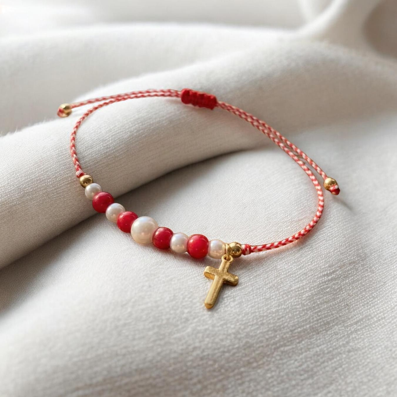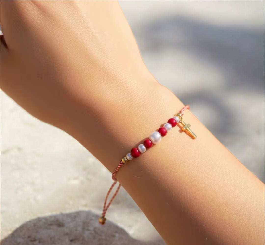 Ανακαλύψτε την ομορφιά ενός αυθεντικού μαρτακίου, φτιαγμένου στο χέρι με προσοχή στη λεπτομέρεια. Το μαρτάκι αυτό συνδυάζει λευκές και κόκκινες χάντρες, σύμβολα ελπίδας και ενότητας, ενώ το χαριτωμένο σταυρουδάκι προσθέτει ένα άγγιγμα κομψότητας.