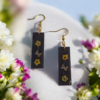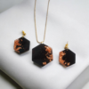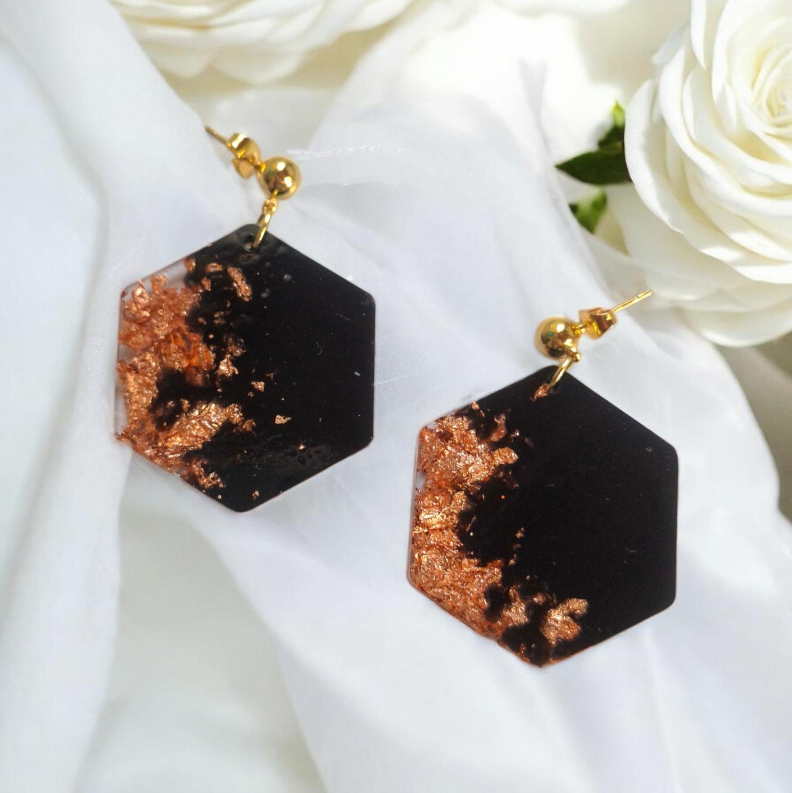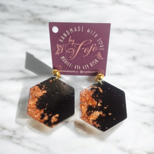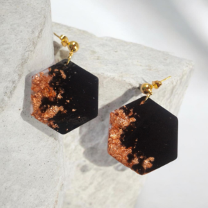 Αναδείξτε το στυλ σας με αυτά τα χειροποίητα κρεμαστά σκουλαρίκια σε εξαγωνικό σχήμα. Το μαύρο χρώμα δίνει μια διαχρονική εμφάνιση, ενώ τα φύλλα χαλκού προσθέτουν παιχνιδιάρικες λαμπερές λεπτομέρειες.