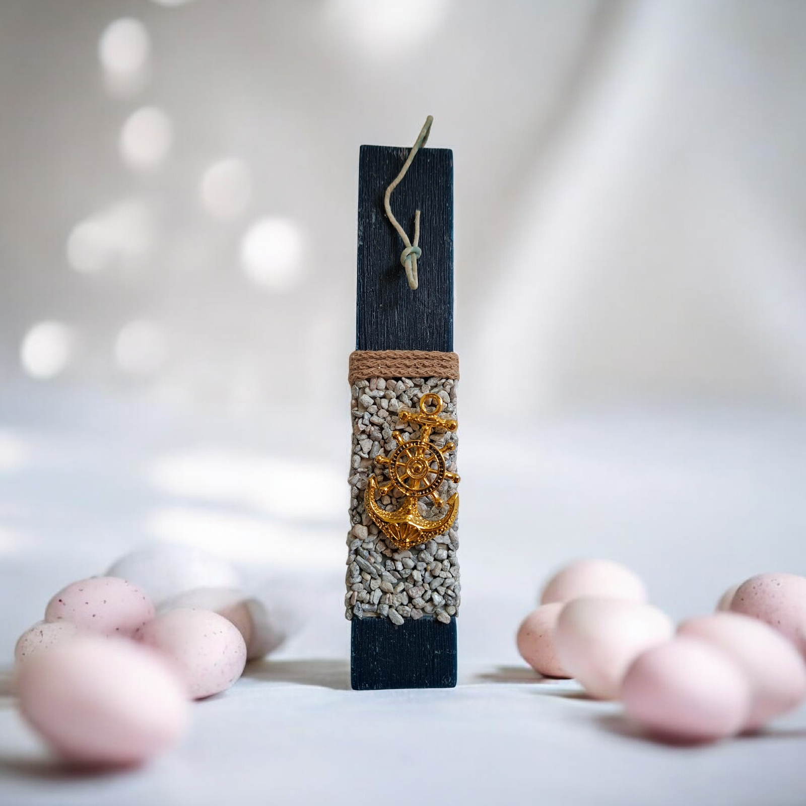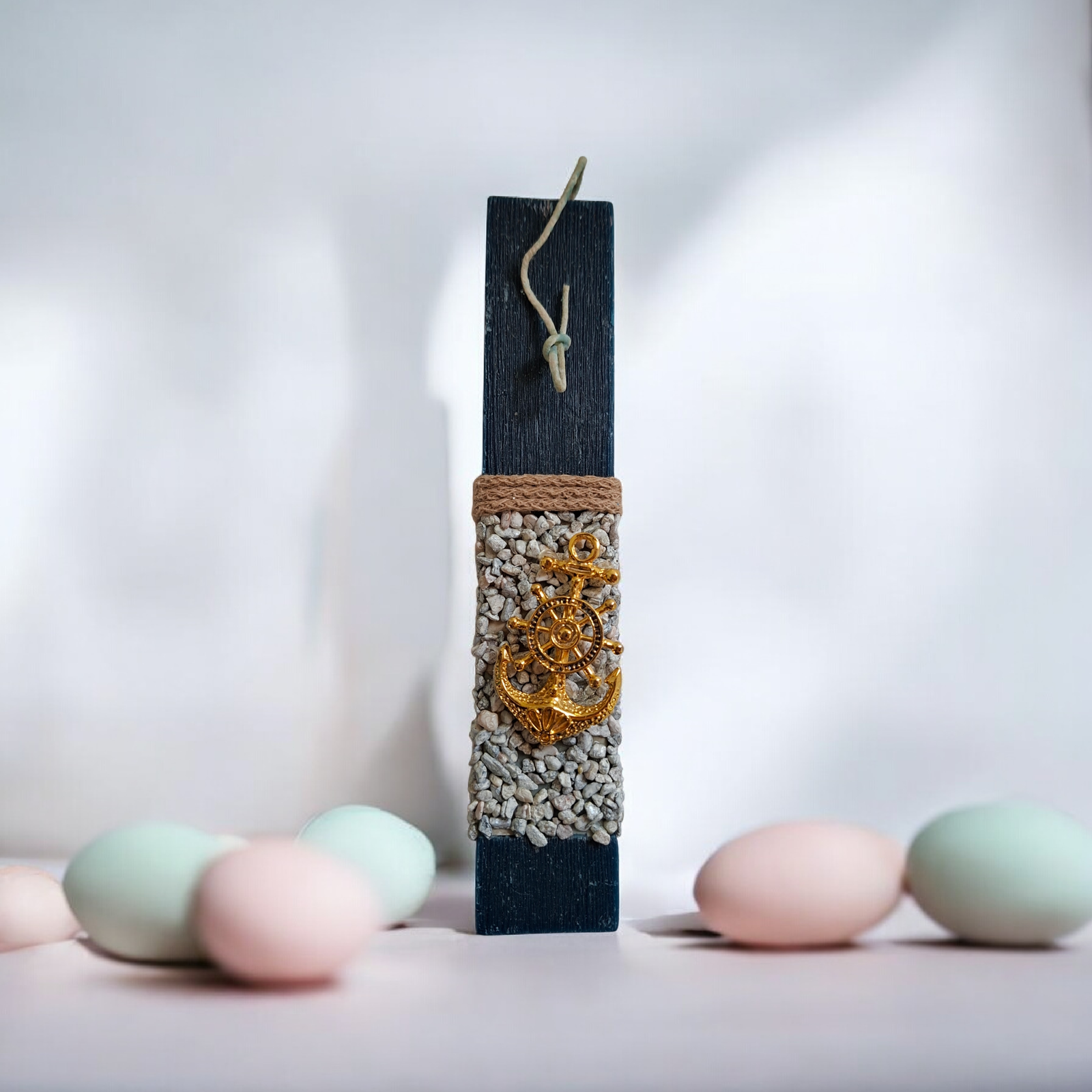 Ανακαλύψτε τη χειροποίητη λαμπάδα τετράγωνου σχήματος σε κομψό μπλε χρώμα. Οι λεπτομέρειες από βότσαλα και άγκυρα δημιουργούν μια θαλασσινή αισθητική που ξεχωρίζει.