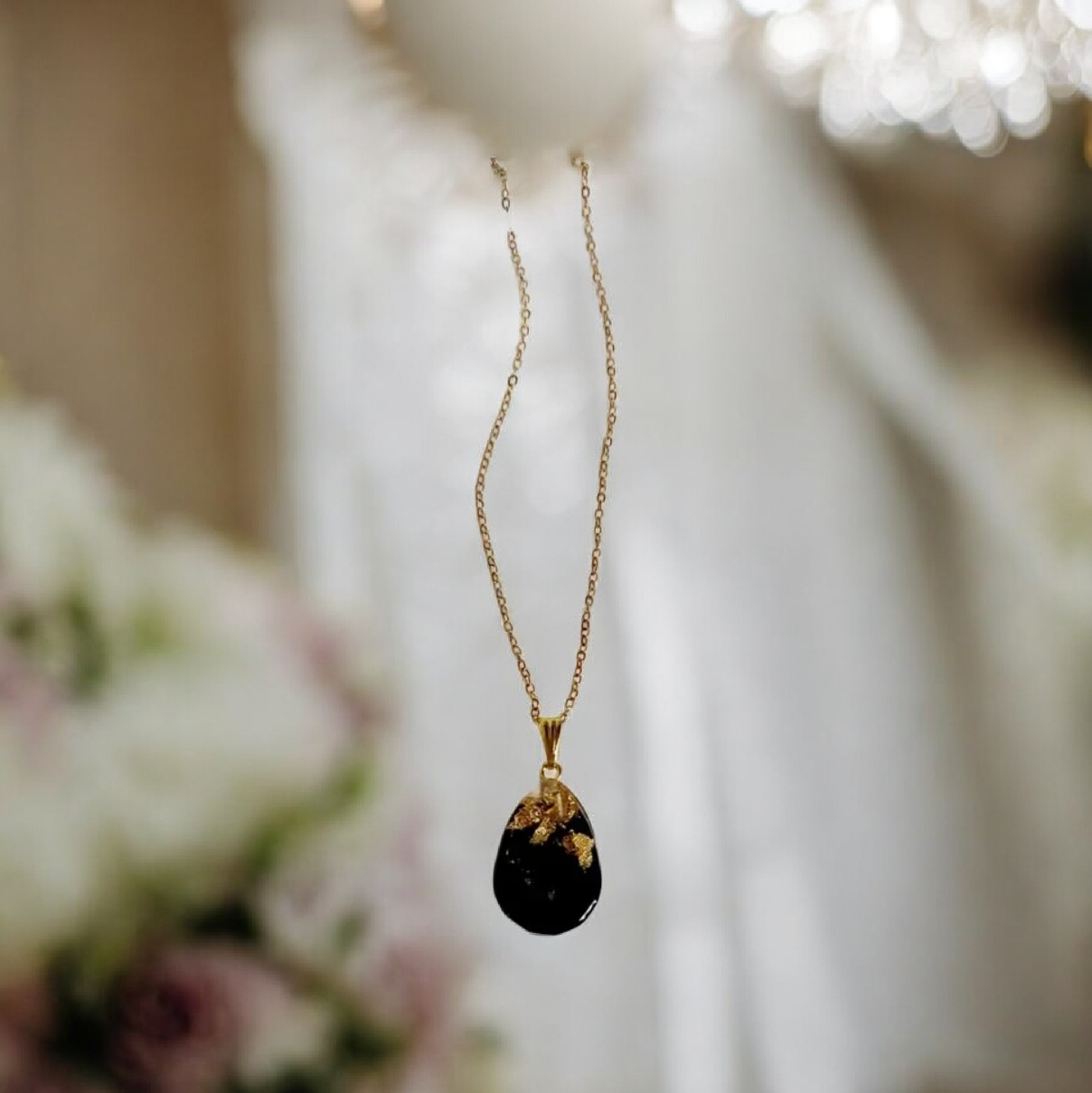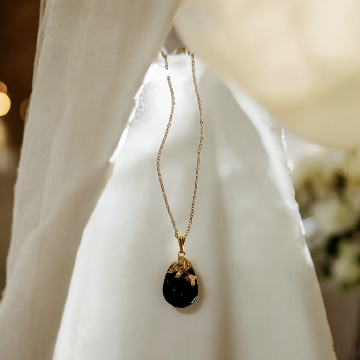 Κάθε κομμάτι δημιουργείται με προσοχή στη λεπτομέρεια, χρησιμοποιώντας υλικά υψηλής ποιότητας. Το υγρό μαύρο γυαλί είναι ειδικά διαμορφωμένο για να αποκτήσει την επιθυμητή υφή και λάμψη, ενώ τα φύλλα χρυσού προστίθενται προσεκτικά για να εξασφαλίσουν την τέλεια ισορροπία ανάμεσα στην διακριτικότητα και την πολυτέλεια. Επιπλέον, το χειροποίητο στοιχείο σημαίνει ότι κάθε κολιέ είναι μοναδικό και ξεχωριστό.