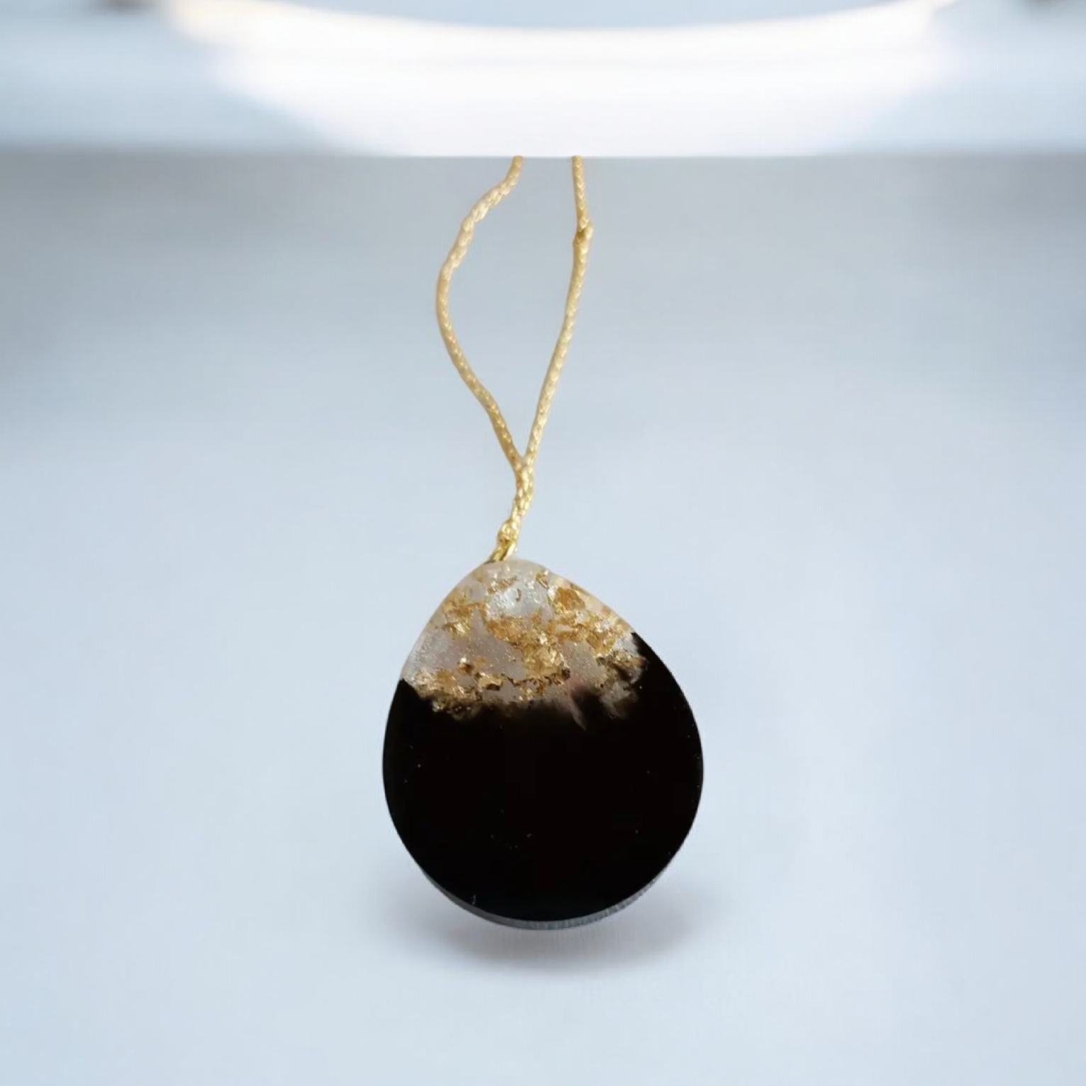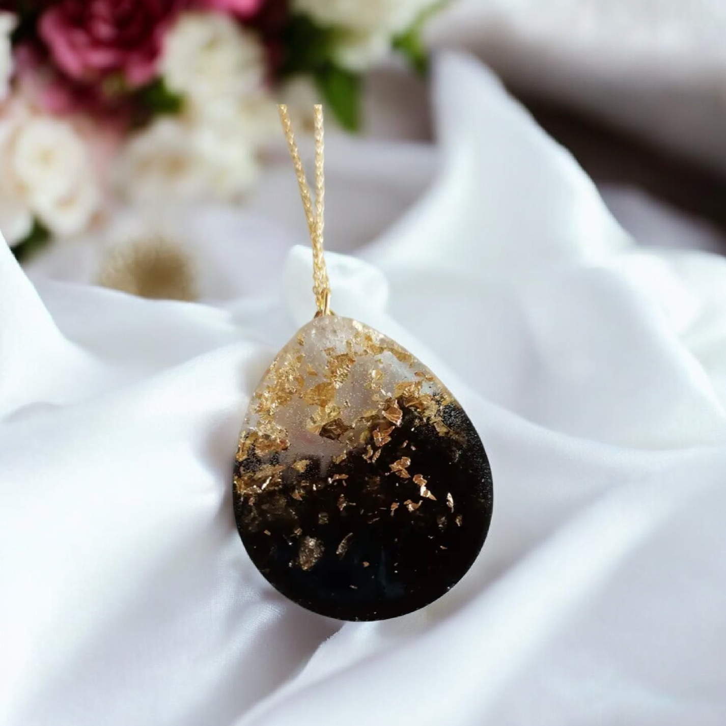 Το κολιέ είναι φτιαγμένο από ιδιαίτερη τεχνοτροπία υγρού γυαλιού, προσδίδοντας ένα εντυπωσιακό γυαλιστερό φινίρισμα που κλέβει τις εντυπώσεις. Το μεγάλο δάκρυ μαύρο συνδυάζεται με φύλλα χρυσού, δημιουργώντας σαγηνευτική αντίθεση χρωμάτων και μοναδικό χαρακτήρα. Κατασκευασμένο για να αναδείξει την εκλεπτυσμένη σας πλευρά, αυτό το κολιέ αποπνέει γοητεία και κομψότητα σε κάθε περίσταση.