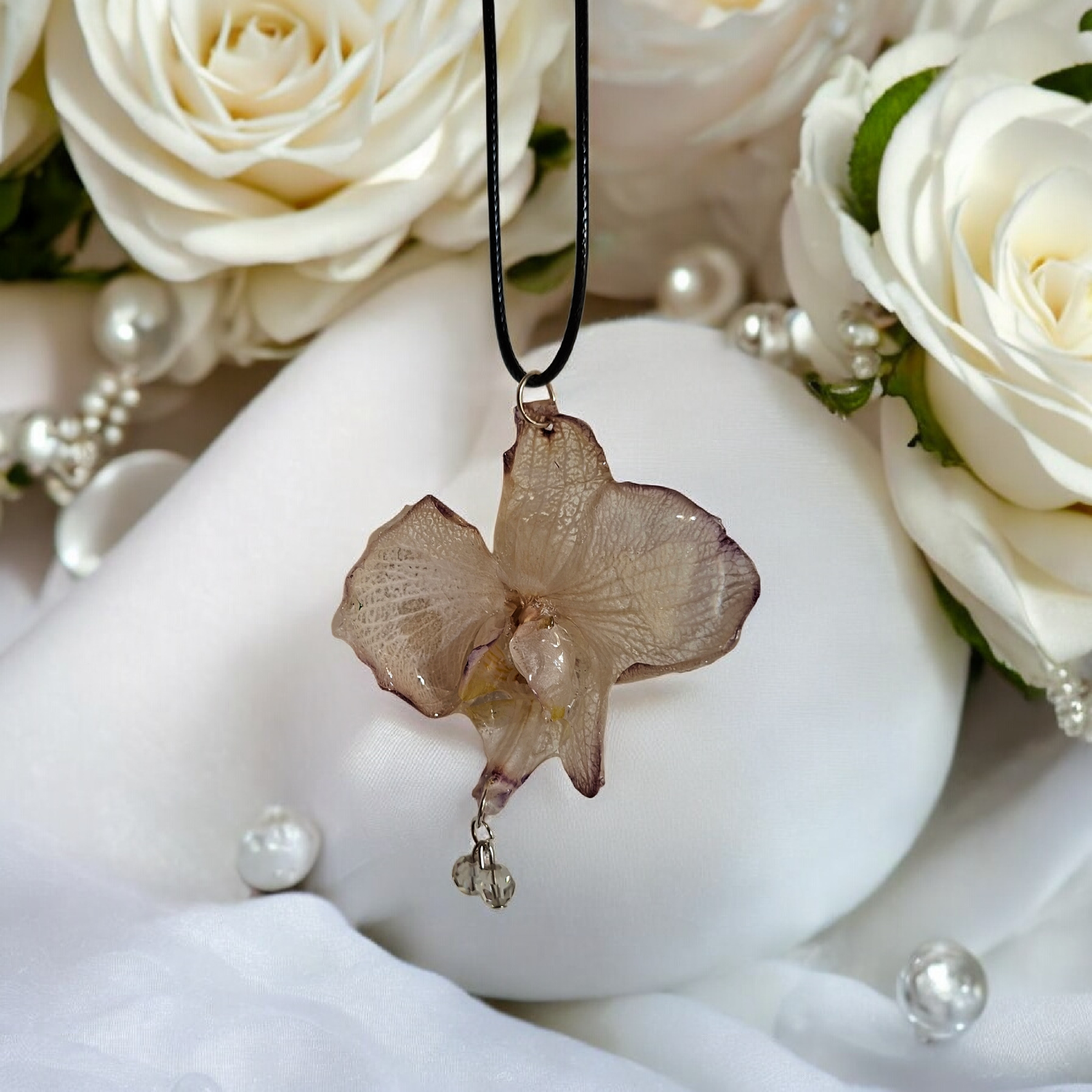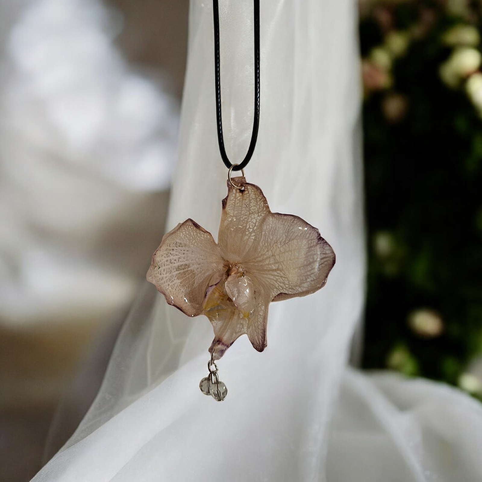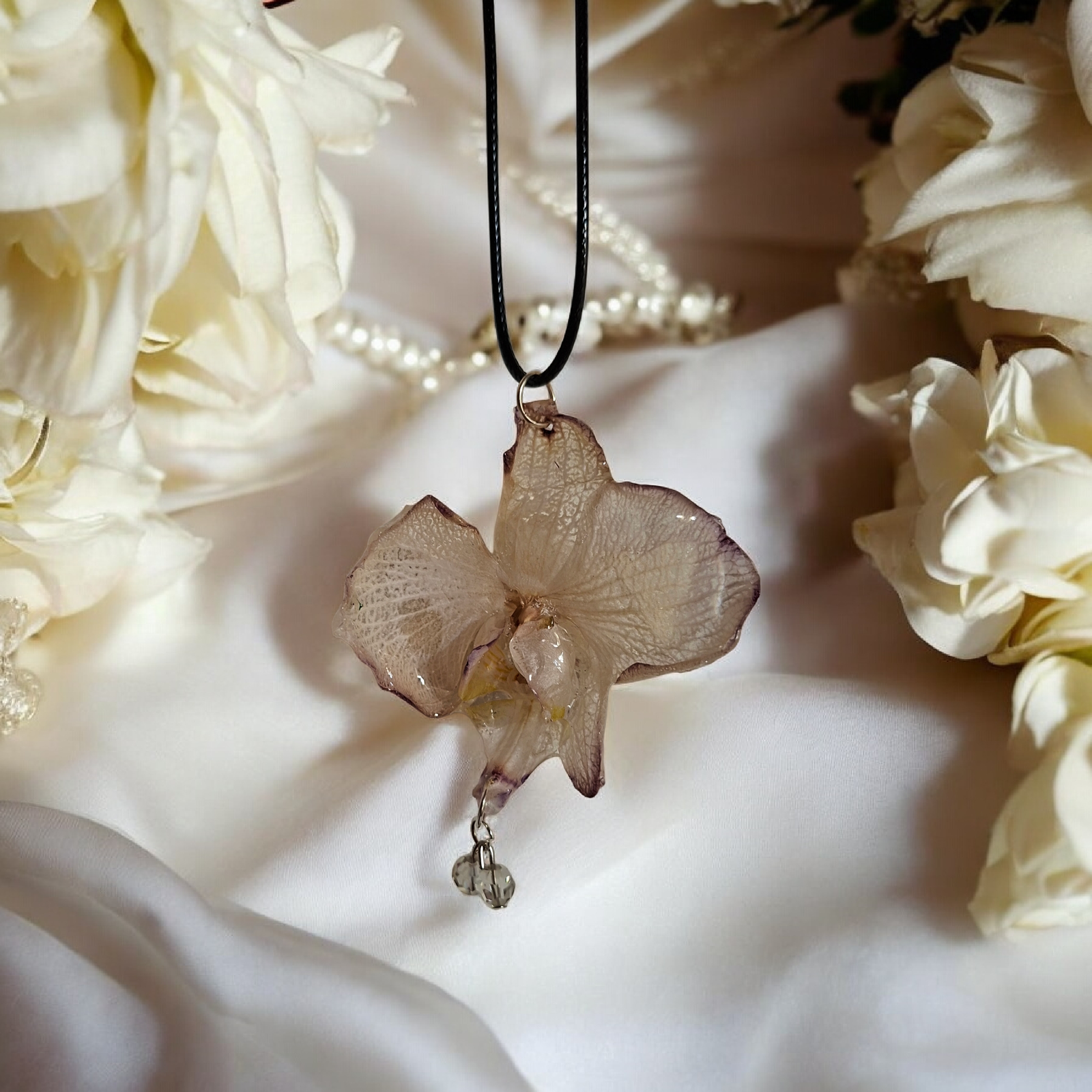 Κατασκευασμένο με ακρίβεια και αγάπη, το κολιέ αναδεικνύει μια αληθινή λευκή ορχιδέα, κλεισμένη προσεκτικά σε υγρό γυαλί. Το εύθραυστο λουλούδι διατηρεί την ομορφιά του για πάντα, αποτελώντας τον ιδανικό συνδυασμό τέχνης και φύσης.