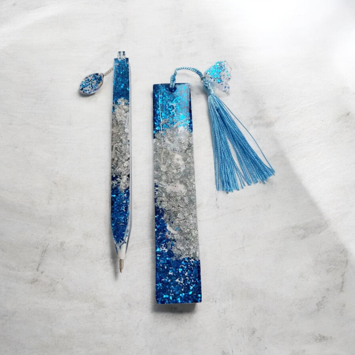 Σετ χειροποίητο στυλό και σελιδοδείκτης από υγρό γυαλί μπλε-ασημί