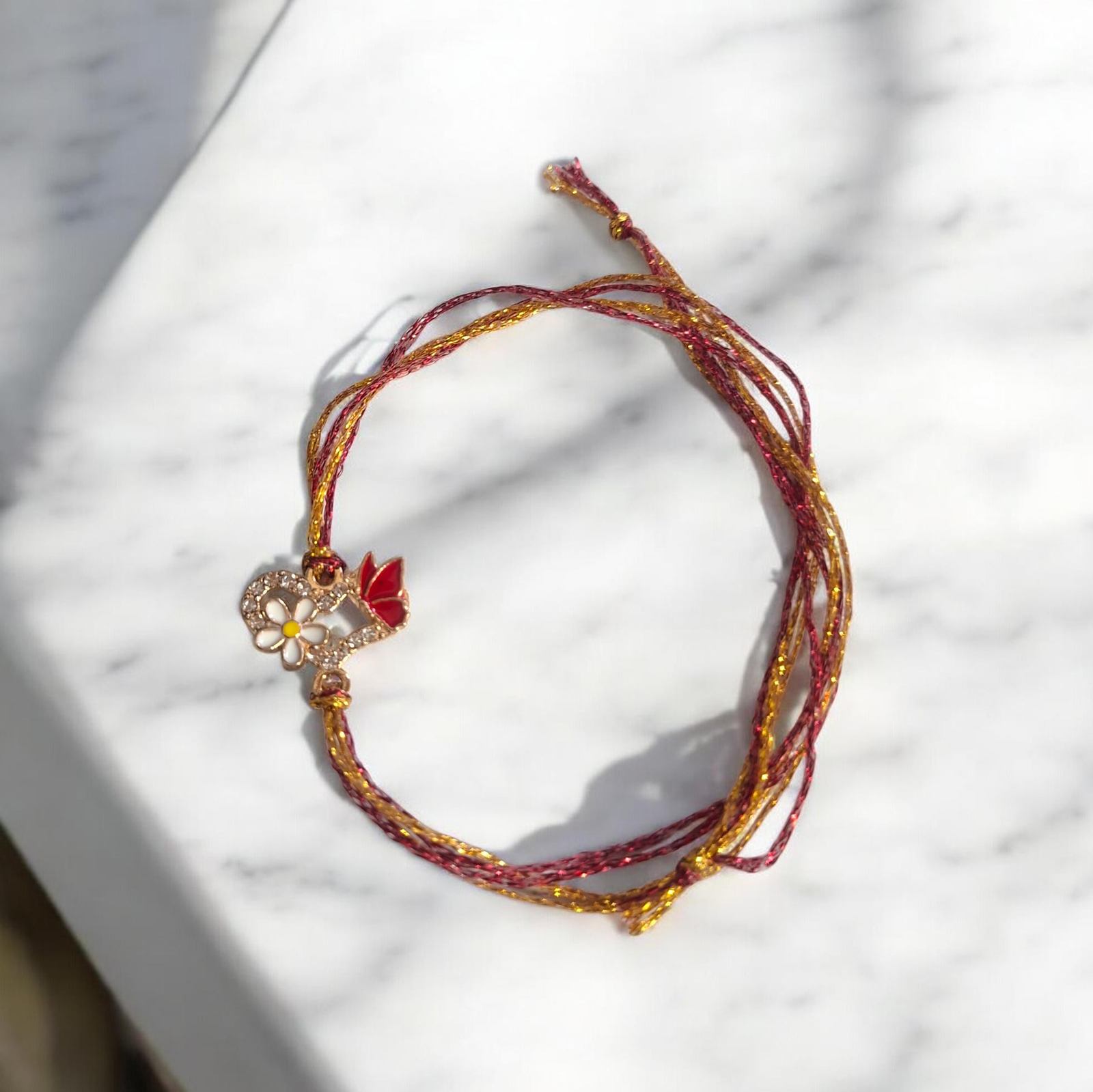 Κατασκευασμένο από ποιοτικά υλικά, το βραχιόλι διαθέτει ανθεκτικό κορδόνι σε χρυσό και έντονο κόκκινο χρώμα, σε συνδυασμό με μία μοναδική καρδιά και πεταλούδα για λεπτομέρειες που εντυπωσιάζουν.
