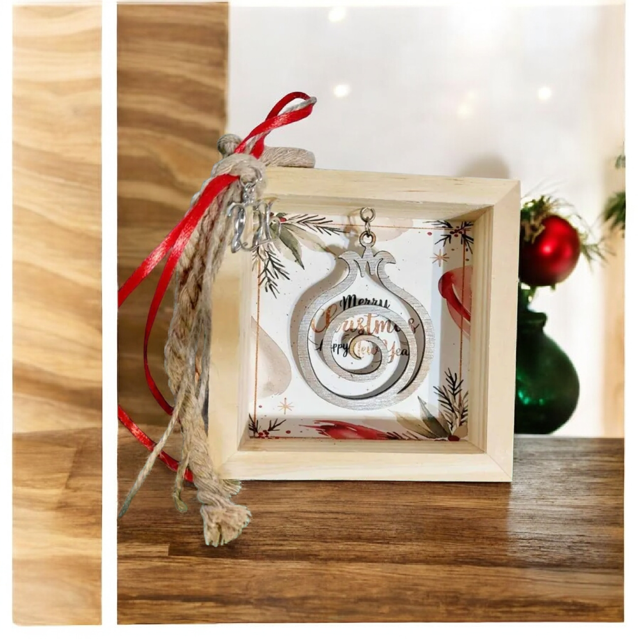Ανακαλύψτε το μοναδικό Γούρι Ξύλινο Καδράκι με Κρεμαστό Ρόδι, έναν ιδανικό τρόπο να προσφέρετε μια αίσθηση ευημερίας και τύχης στον χώρο σας ή στους ανθρώπους που αγαπάτε. Κατασκευασμένο από ποιοτικό ξύλο και διακοσμημένο με ένα κρεμαστό ρόδι αριστοτεχνικής λεπτομέρειας, αυτό το γούρι ενσωματώνει παραδοσιακές αξίες και κομψότητα σε κάθε του διάσταση.