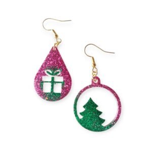 Χειροποίητα χριστουγεννιάτικα σκουλαρίκια από υγρό γυαλί, Ροζ Δώρο/Πράσινο Δέντρο