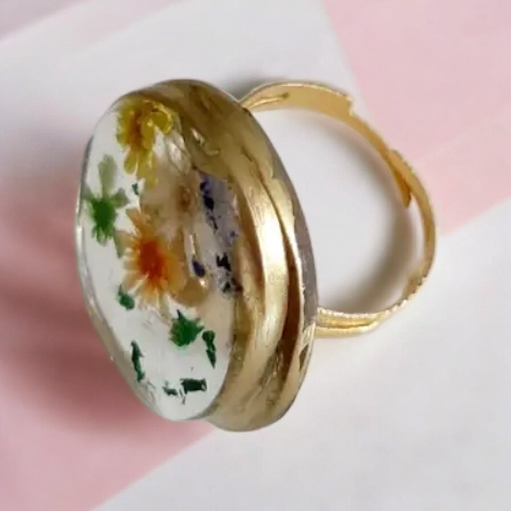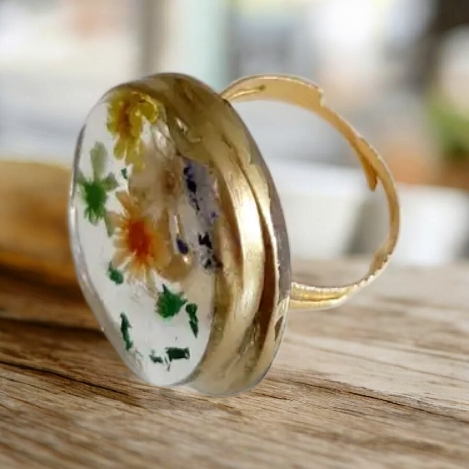 Χειροποίητο δαχτυλιδι από υγρό γυαλί με αποξηραμένα λουλούδια μαργαρίτα