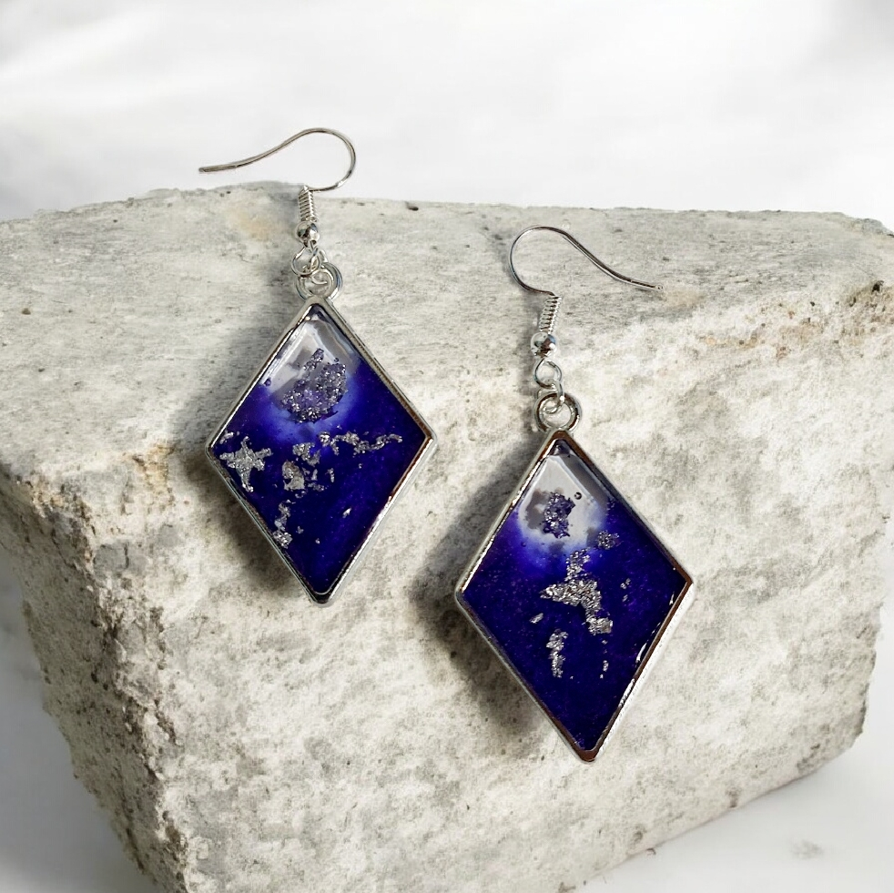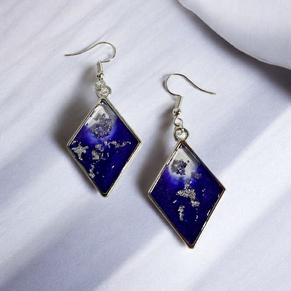 Αυτά τα μαγευτικά χειροποίητα σκουλαρίκια σε σχήμα ρόμβου, φτιαγμένα από υγρό γυαλί, είναι το απόλυτο statement αξεσουάρ για τις εμφανίσεις σας. Με την τέλεια ισορροπία ανάμεσα στο μωβ χρώμα και την ασημί λάμψη, εκπέμπουν κομψότητα και μοντέρνα αισθητική που θα σας κάνει να ξεχωρίζετε.