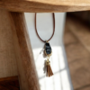 Αναδείξτε την προσωπικότητά σας με αυτό το μοναδικής ομορφιάς χειροποίητο κολιέ. Δημιουργημένο από υγρό γυαλί, το κόσμημα συνδυάζει εκλεπτυσμένο design και ποιοτική κατασκευή, κάνοντάς το ιδανικό για κάθε περίσταση. Η αναπαράσταση πέτρας και η καλαίσθητη καφέ φούντα προσδίδουν μια φυσική αρμονία, κάνοντάς το να ξεχωρίζει από κάθε άλλο κόσμημα στην τύπολογία του.