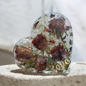 Ο σχεδιασμός της ανθοδέσμης είναι εμπνευσμένος από την καρδιά, το παγκόσμιο σύμβολο της αγάπης. Το υγρό γυαλί προσφέρει μία λαμπερή και διαφανή υφή που αναδεικνύει τα όμορφα χαρακτηριστικά του προϊόντος. Η κατασκευή εξασφαλίζει προστασία από φθορές και μακροχρόνια ανθεκτικότητα, ενώ η επιλογή χρωμάτων και υλικών προσφέρει μία αισθητική που ταιριάζει σε κάθε χώρο.