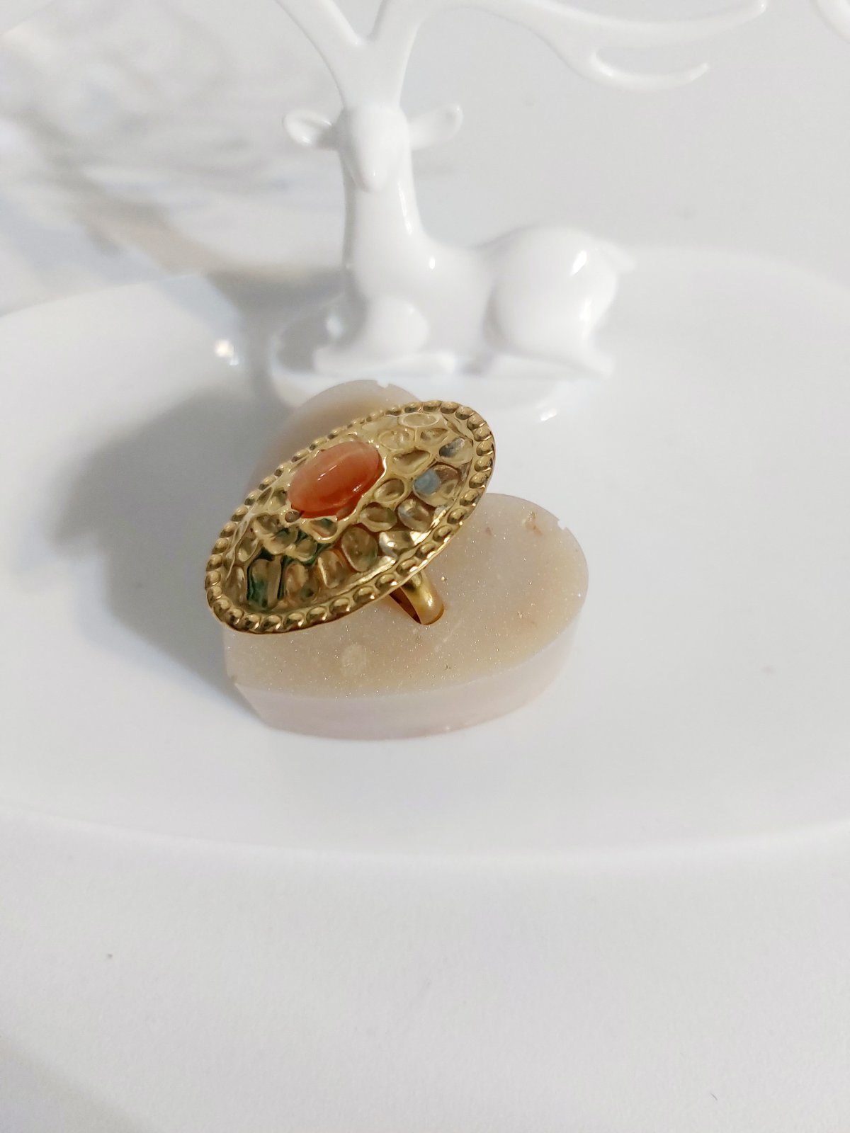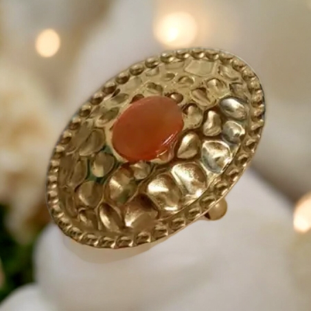 Το δαχτυλίδι έχει δημιουργηθεί από ανθεκτικό και υψηλής ποιότητας μέταλλο που εξασφαλίζει μακροχρόνια χρήση χωρίς να χάνει τη λάμψη του. Η πορτοκαλί πέτρα στον κεντρικό του σημείο εκπέμπει μια ζεστή λάμψη, προσθέτοντας μια πινελιά πολυτέλειας και ζωντάνιας. Η πέτρα έχει τοποθετηθεί με προσοχή για να διασφαλιστεί η αντοχή και η άψογη αισθητική.