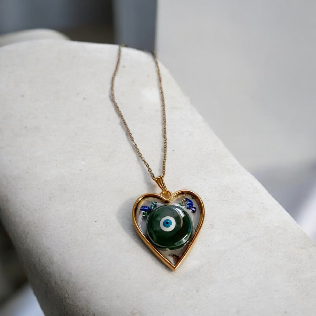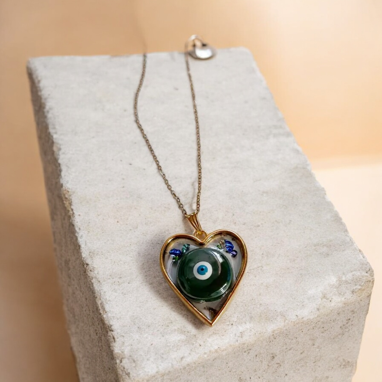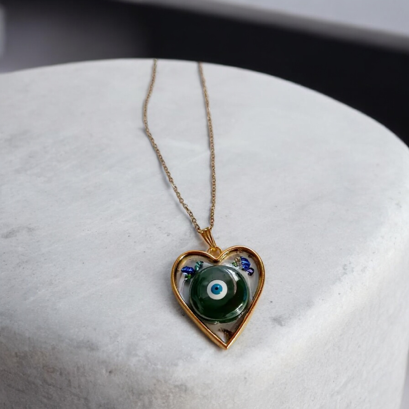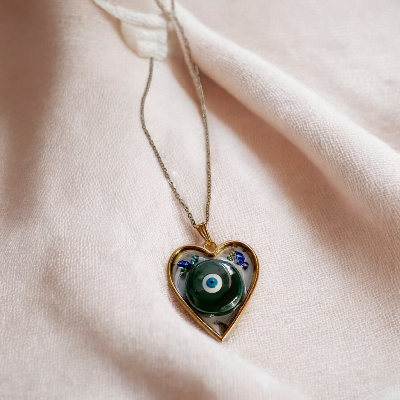 Κολιέ από υγρό γυαλί με κεραμικο ματάκι πράσινο σε καρδιά με αλυσίδα