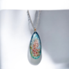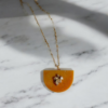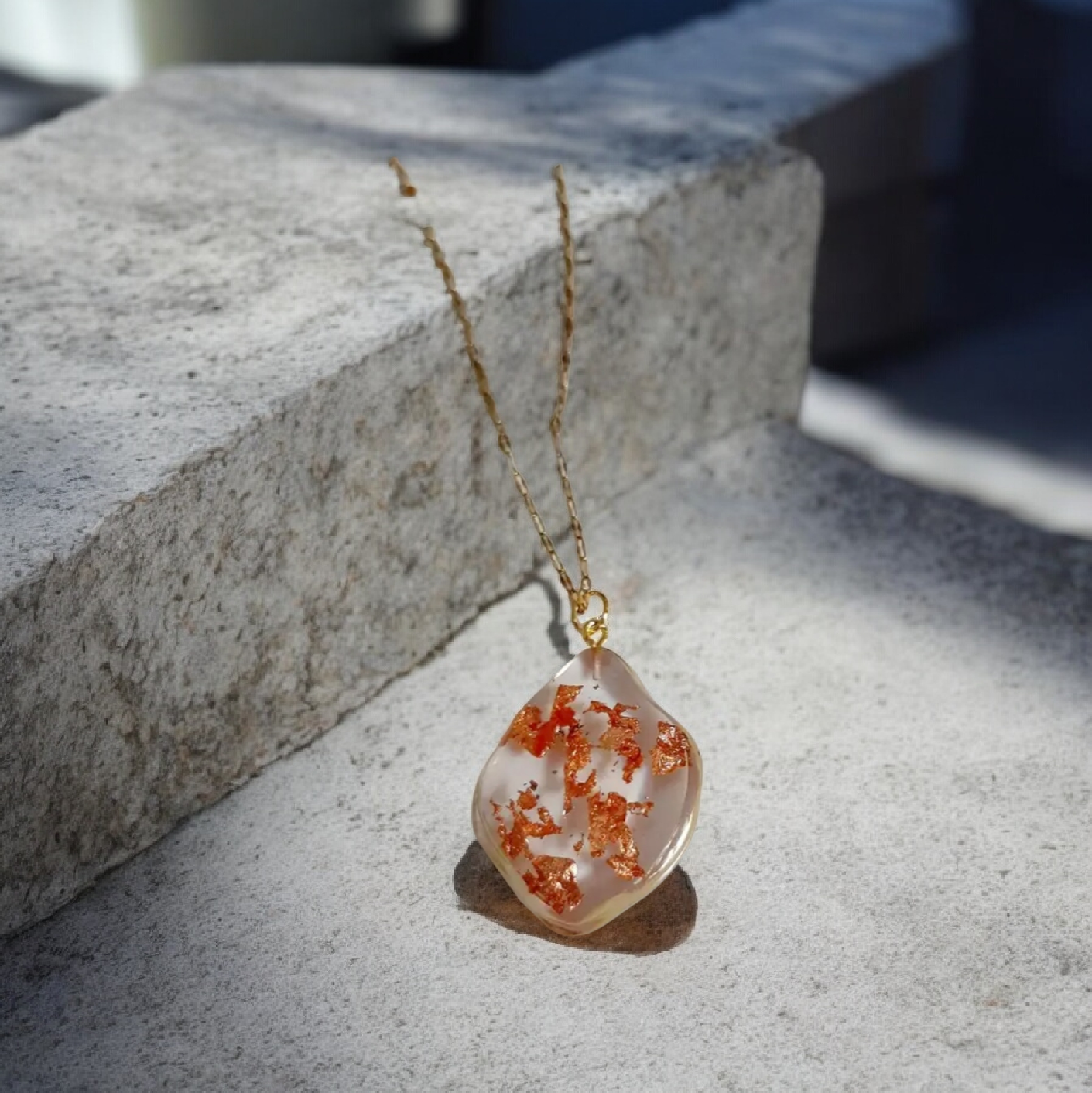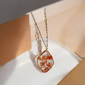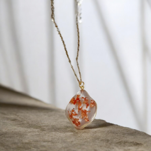 Κατασκευασμένο από υγρό γυαλί και εμπλουτισμένο με φύλλα χρυσού, αυτό το κολιέ ενσωματώνει τη λάμψη του χρυσού με τη διαφάνεια και την λεπτεπίλεπτη ομορφιά του γυαλιού. Τα υλικά υψηλής ποιότητας εγγυώνται την ανθεκτικότητα του κοσμήματος, ενώ η τέχνη της χειροποίητης κατασκευής δίνει μία μοναδική πινελιά στην κάθε δημιουργία. Ένα κόσμημα που ξεχωρίζει για την ομορφιά και την μακροχρόνια χρήση του.