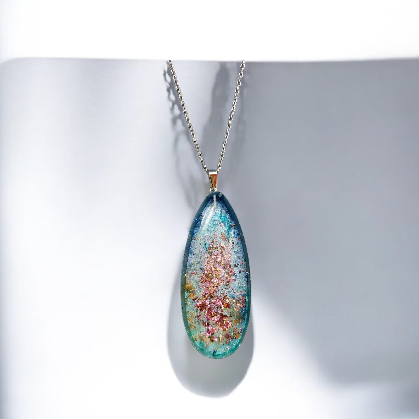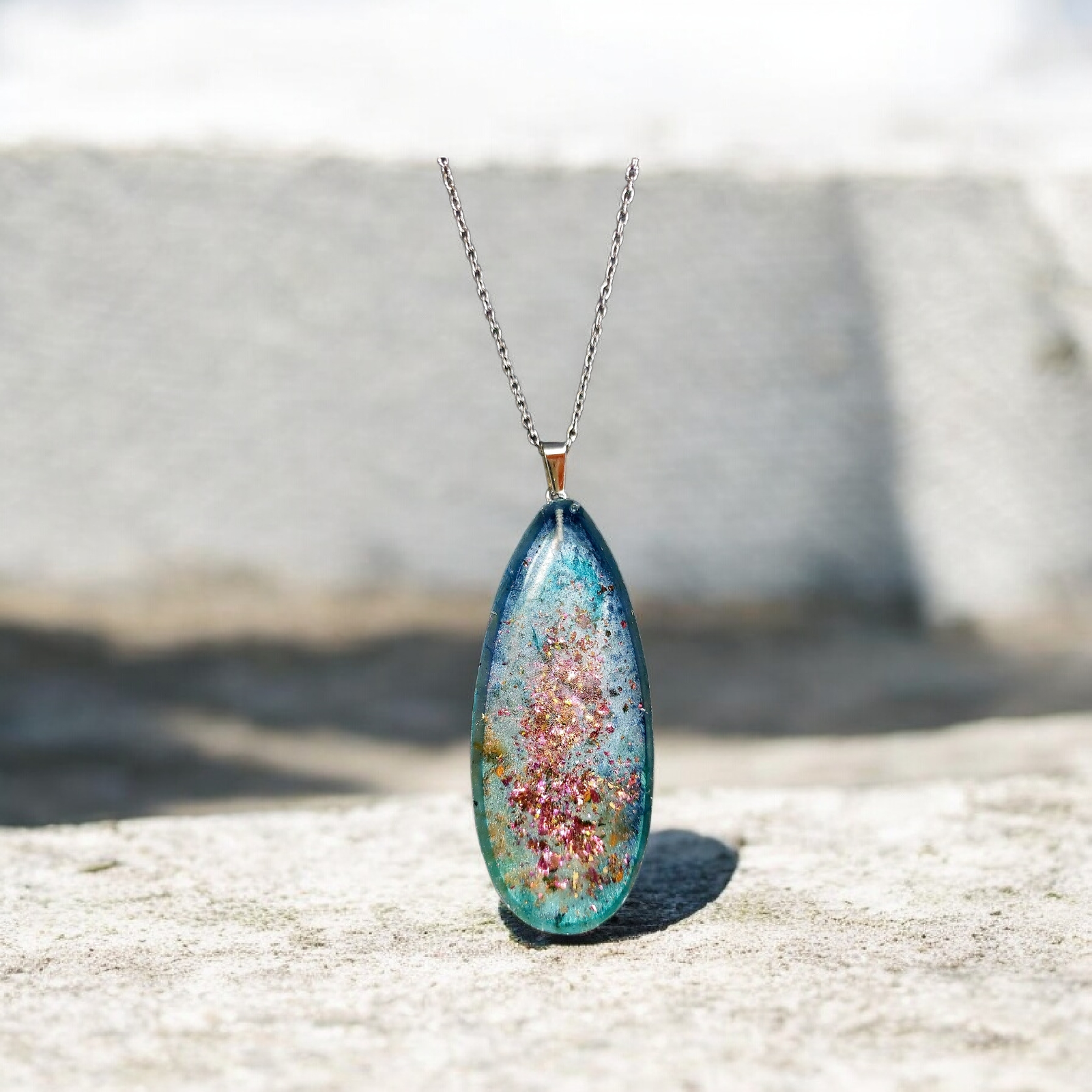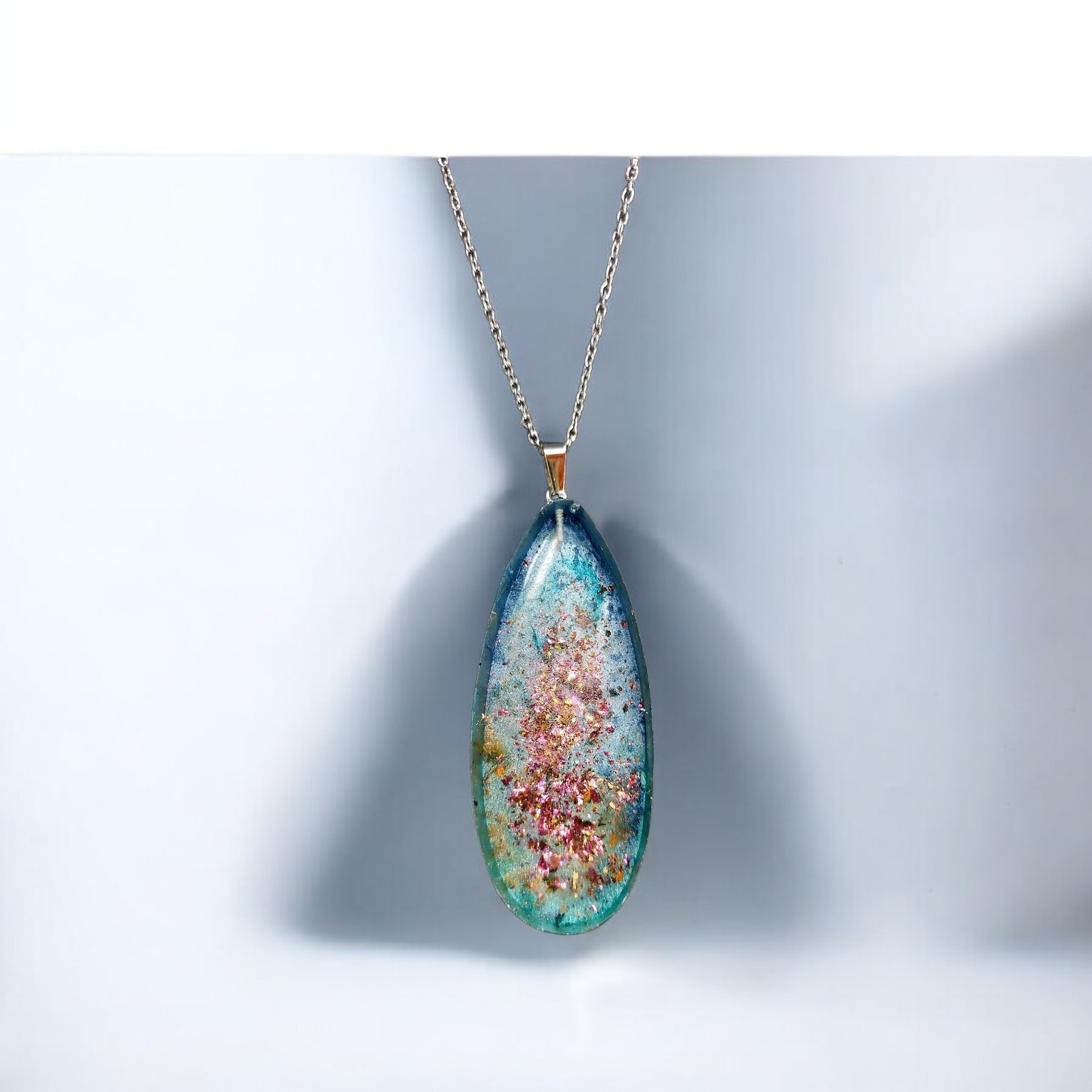 Κολιέ δάκρυ μεγάλο από υγρό γυαλί σε ασημί και μπλε