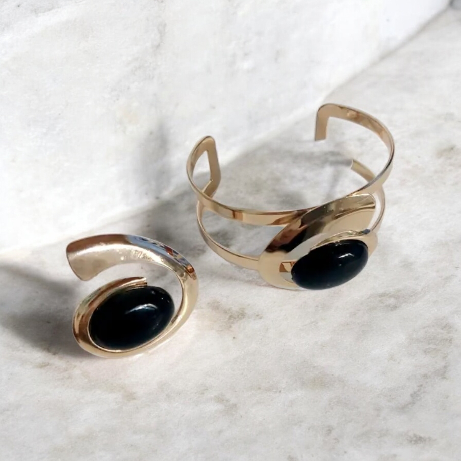 Αυτό το σετ βραχιόλι και δαχτυλίδι μεταλλικά με μαύρη πέτρα είναι η ιδανική επιλογή για δώρο που θα ενθουσιάσει τον παραλήπτη. Ένα πάθος για κοσμήματα που συνδυάζουν απλότητα και πολυτέλεια. Συνδυάζεται εύκολα με άλλα αξεσουάρ και ενισχύει την εμφάνιση σας σε κάθε περίσταση.