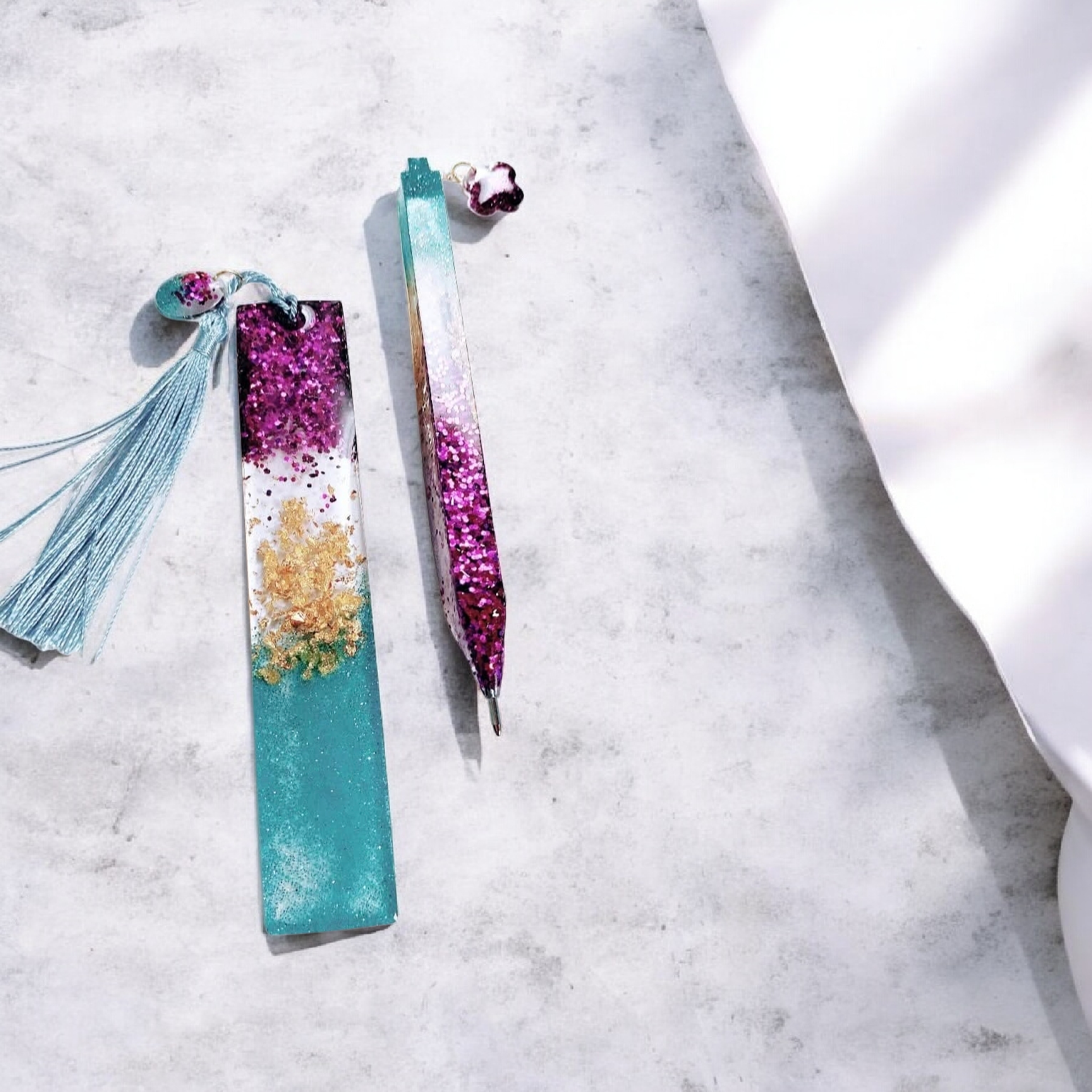 Αναζητάτε ένα ξεχωριστό δώρο για έναν αγαπημένο σας, ή θέλετε να προσθέσετε μια πινελιά πολυτέλειας στην καθημερινότητά σας; Το σετ σελιδοδείκτης και στυλό από υγρό γυαλί σε τυρκουάζ, μωβ και φύλλα χρυσού είναι η ιδανική επιλογή. Κάθε κομμάτι είναι χειροποίητο, καθιστώντας το μοναδικό και ανεπανάληπτο. Η λάμψη του χρυσού συνδυάζεται αρμονικά με τα ζωηρά χρώματα του τυρκουάζ και του μωβ, δημιουργώντας ένα εντυπωσιακό αποτέλεσμα που θα μαγνητίσει τα βλέμματα.